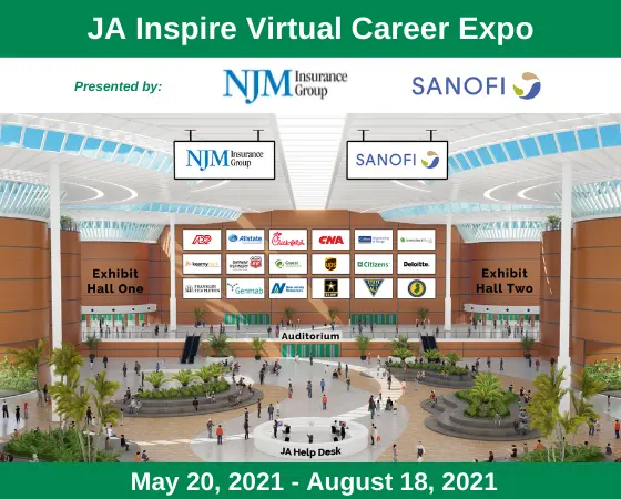 JA Inspire Virtual Career Expo is Junior Achievements capstone career development program for 7th 12th grade students brought to life by New Jersey employers. Using virtual technology, the Inspire Virtual Expo features a mega online career event filled with 100 local business exhibits providing downloadable career information and exhibitor videos.